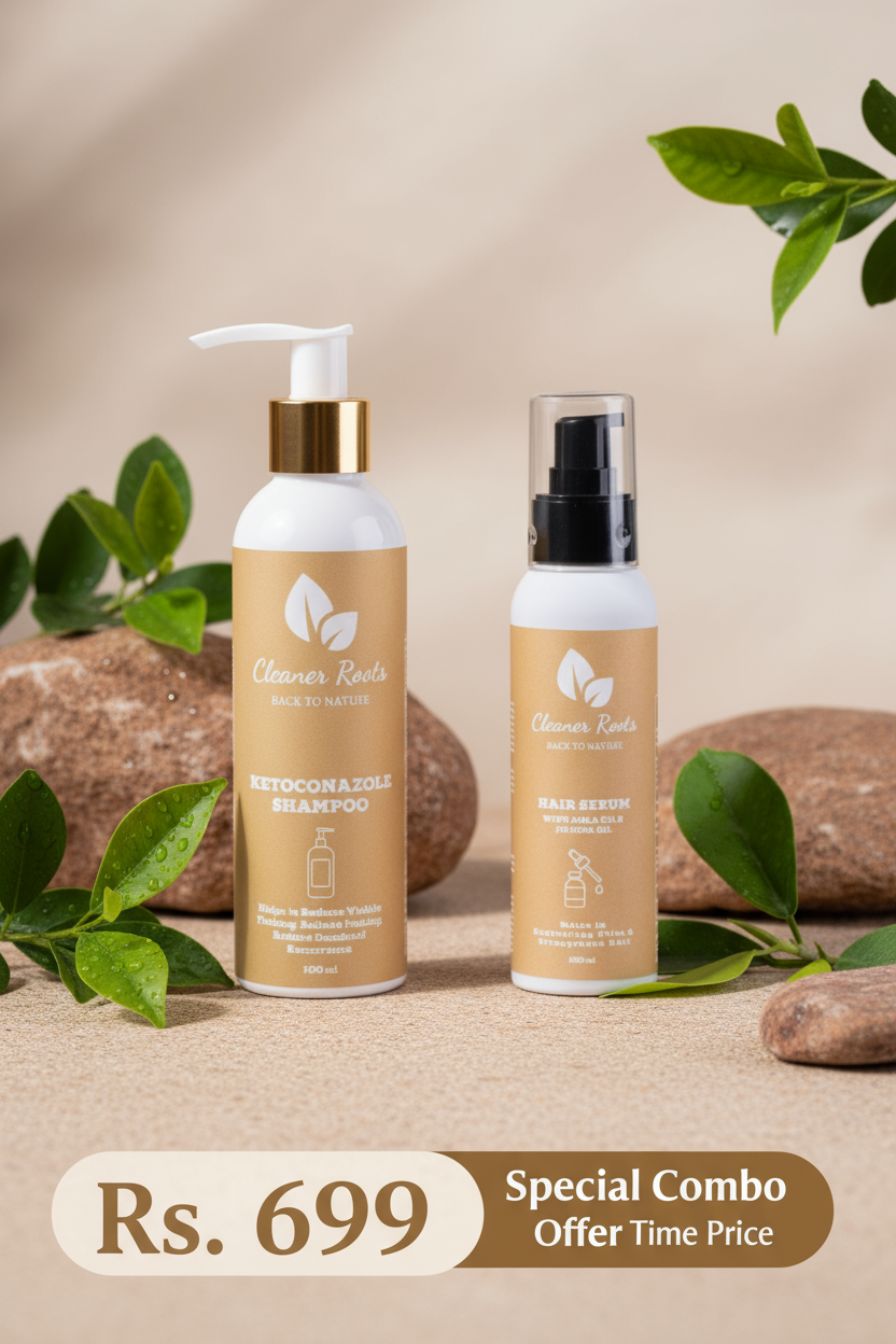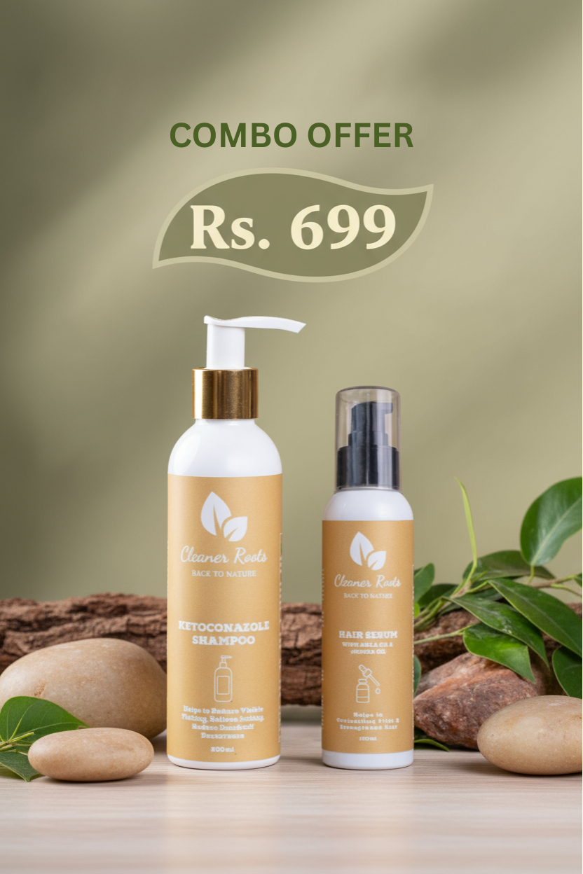 Tackle dandruff, dryness, and dullness with our Ketoconazole Shampoo + Hair Serum with Amla & Jojoba Oil Combo Pack.