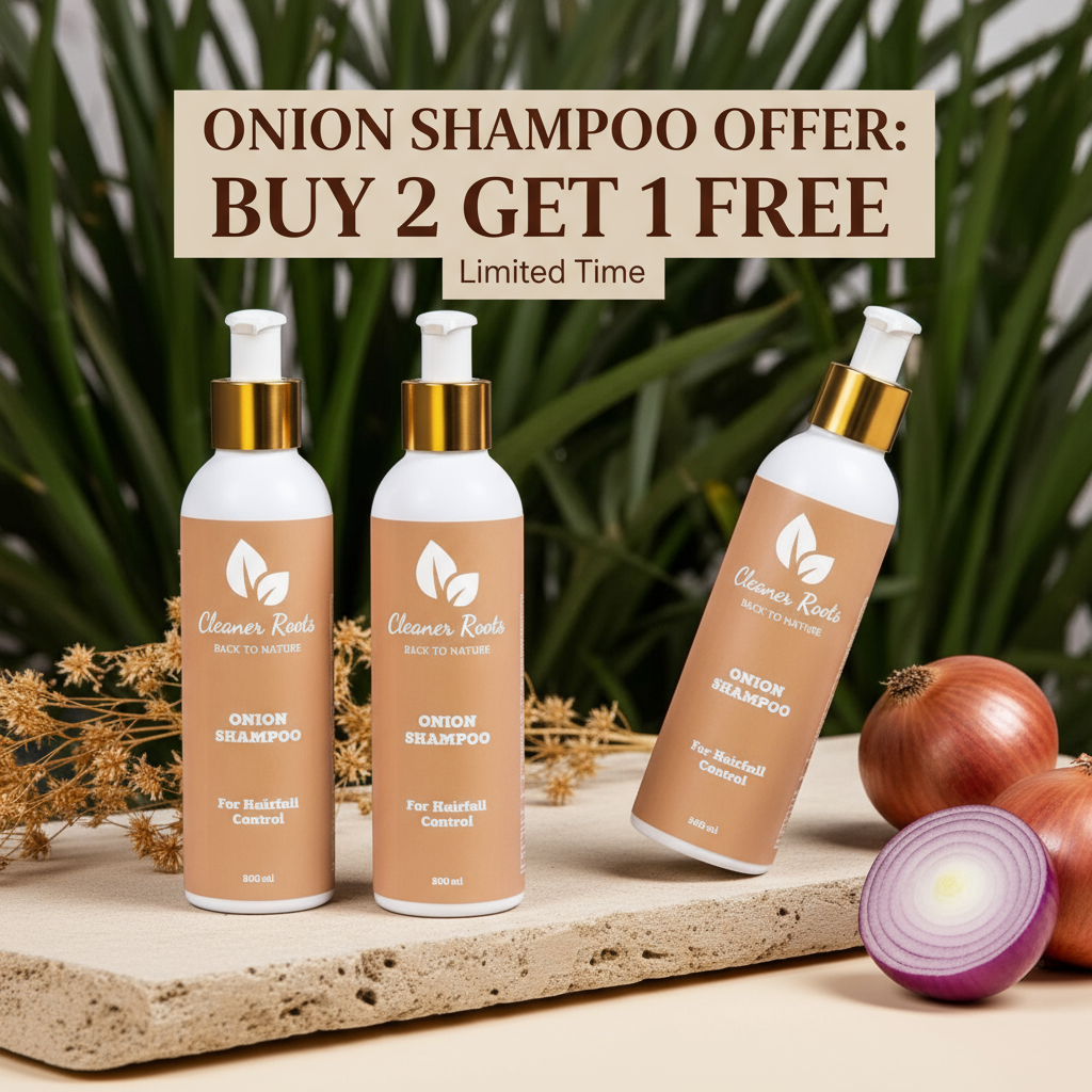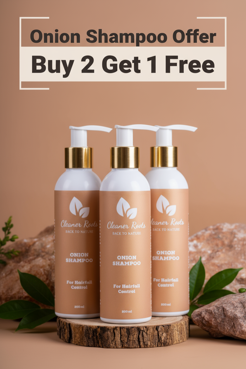 Cleaner Roots Onion Shampoo Combo Pack (Buy 2 Get 1 Free) is the perfect solution for anyone looking to stay committed to natural, consistent hair care. Infused with Onion Extract to reduce hair fall, Amla & Brahmi to strengthen roots, and Neem Oil & Aloe Vera to maintain scalp balance, this herbal shampoo works deeply to restore shine, volume, and vitality. Whether you’re fighting dullness, thinning, or scalp imbalance, this combo ensures you never run out of your Ayurvedic hair essential.